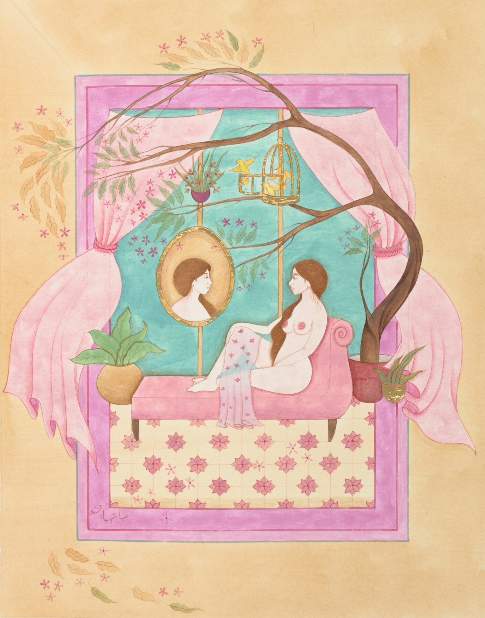 In Solitude, Schahbaz’s timely new body of work, considers what it means to be an artist during a period of global crisis. Responding directly to her surroundings, Schahbaz’s collection of narrative painting was created in a home studio space as she isolates during the COVID-19 quarantine in New York City. Forced to pause her large-scale works following the temporary closure of her studio, the works in In Solitude mark a return to her life-long practice of creating meditative works on paper. Her intricate process is meticulous, reflective, and adheres stylistically to the traditions of Indo-Persian miniature painting, including high detail and a painted border. Schahbaz’s lyrical depictions of women are interwoven with references to intimate self-portraiture and iconography drawn from her own personal mythology. The work is at once deeply personal and reflective of a shift in Schahbaz’s mindset towards the creation of art as an act of service in a time of suffering. Each piece functions as a window into a narrative that transports the viewer into a space of harmony and gentleness, encouraging feelings of solace and hope for the world.