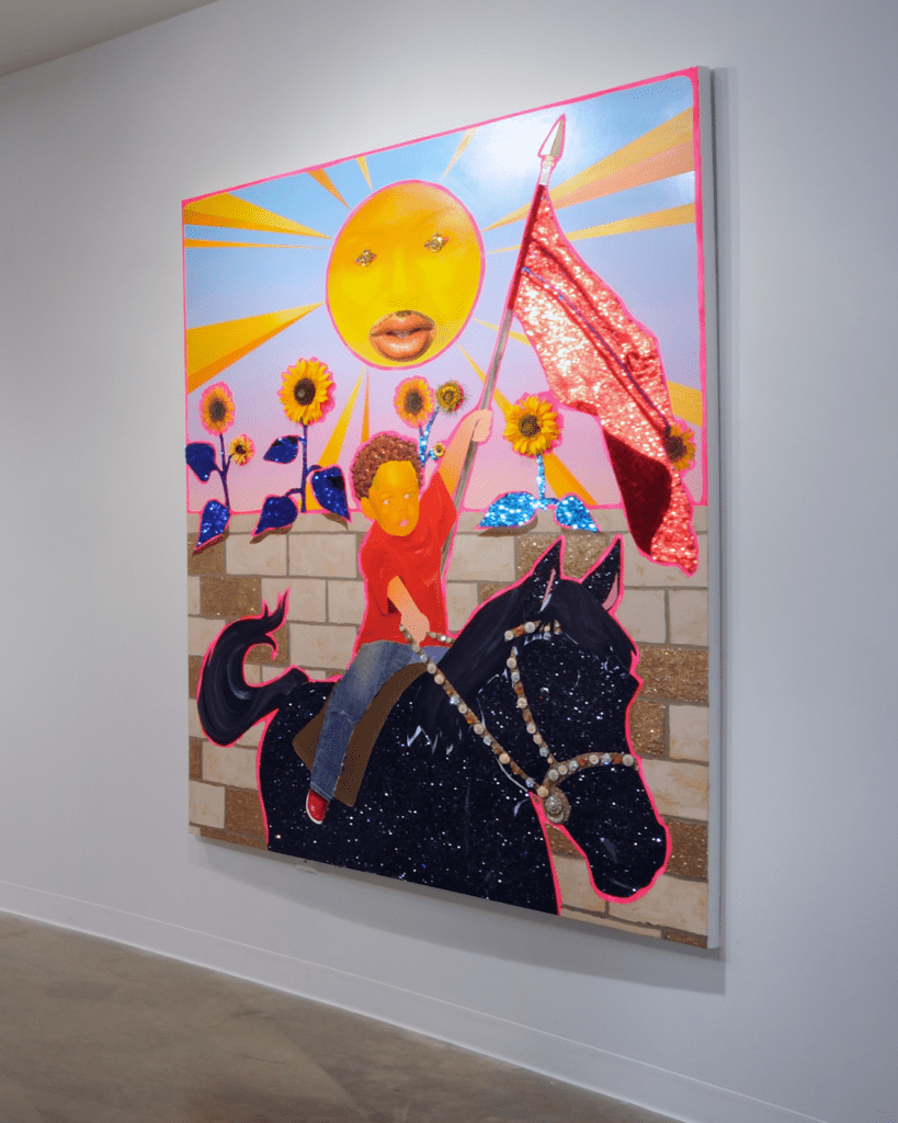 “Make-Believe,” an exhibition at the American University Museum at the Katzen Arts Center featuring the work of Georgia Saxelby and Devan Shimoyama, explores artistic world-building and the crafting of alternate realities. The exhibition presents sculptures by Saxelby and paintings by Shimoyama in the context of a post-pandemic world where fantasies and the imagination have played increasingly vital roles. “Make-Believe” considers the artists’ shared use of decoration, craft and visual pleasure, both using highly saturated, lustrous and reflective surfaces to blur the real and the imaginary.