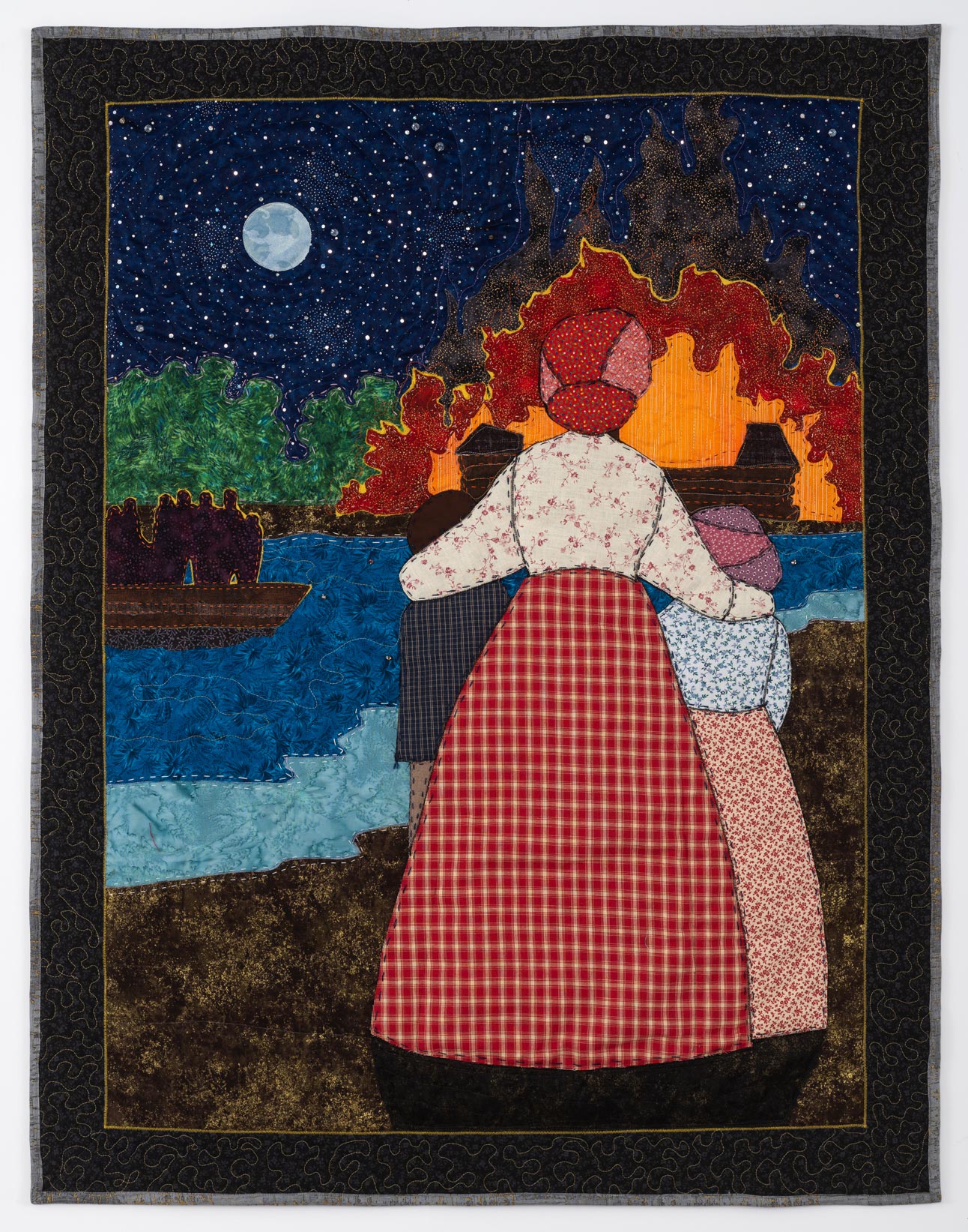 Natural and synthetic fabric, polyester and cotton thread, crystal glass beads.